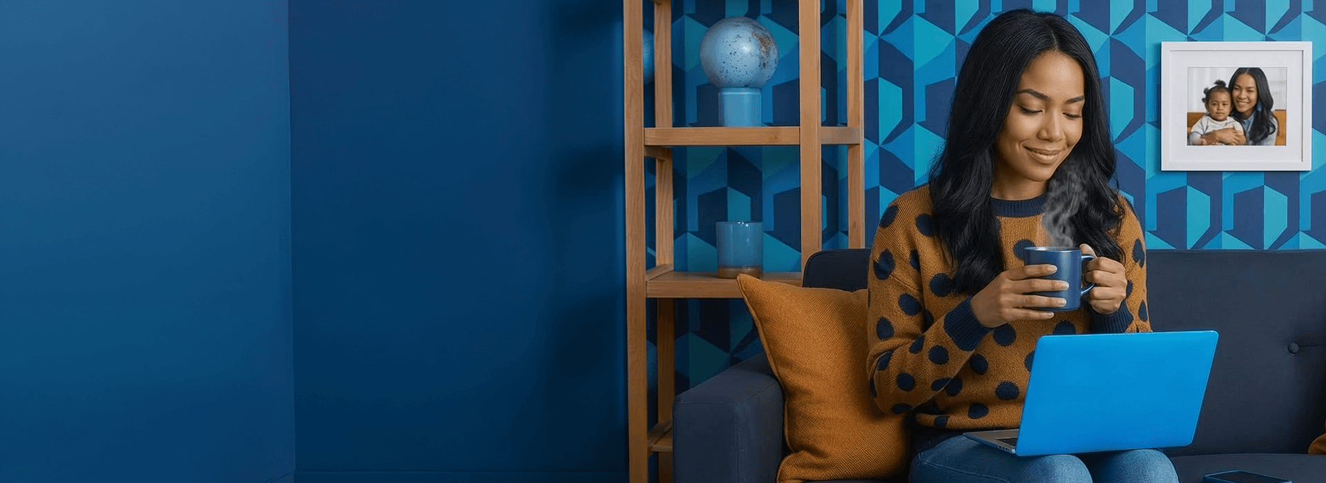 Family of 4, sitting on couch focused on the laptop